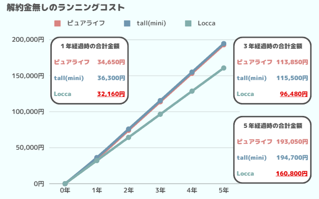 最低契約期間が一番長いので注意が必要ですが、長期利用が前提ならLocca・Slim-Rがもっともお得になります。