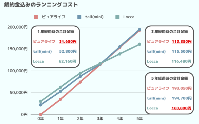 一方、こちらのグラフは解約金込みのランニングコストです。
