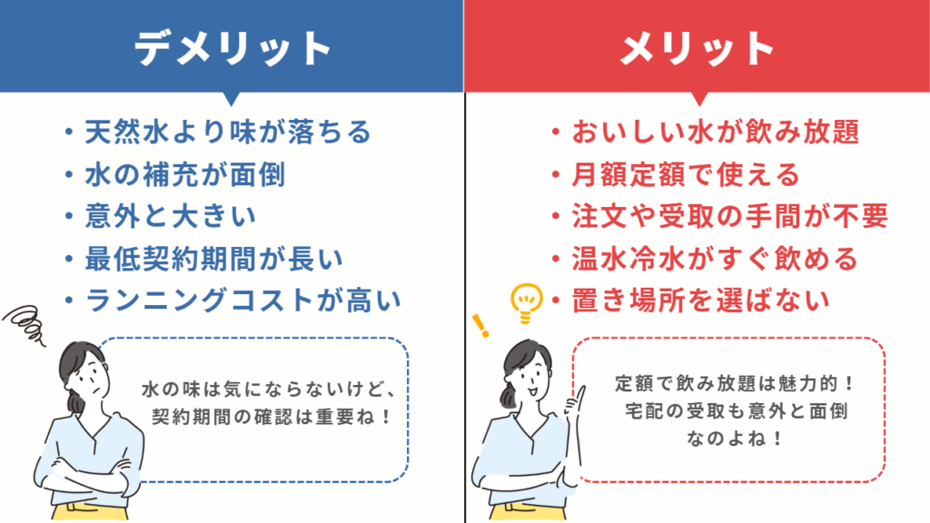 ここからは、浄水・給水型ウォーターサーバーのメリット・デメリットを見ていきましょう。